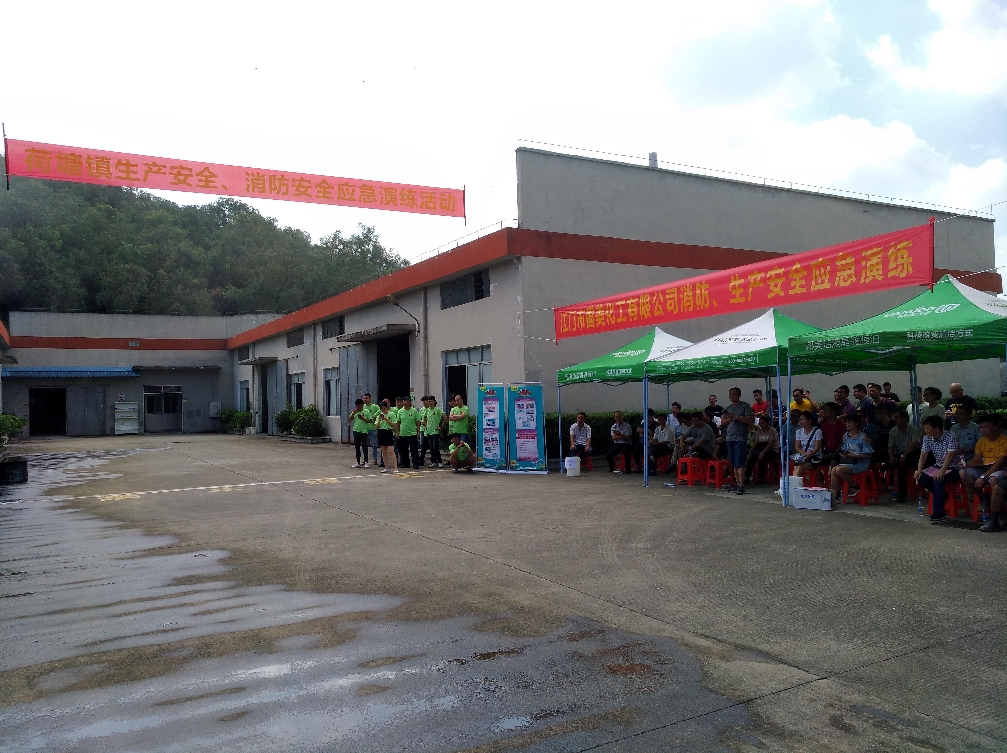 活动现场共有四项流程:一是由荷塘镇安监局负责人王伟国作动员讲话;二是由江门市国美化工有限公司负责人讲述如何配合专家开展日常安全生产管理工作;三是由镇消防专职中队、荷塘卫生院、江门市国美化工有限公司联合开展消防应急演练,并由专家对消防应急演练作点评,现场介绍对企业开展风险管控和隐患排除的相关措施和做法;四是现场进行安全生产咨询并参观车间管理情况。
