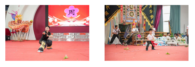 仪式结束后,大家共同走进沙富小学,进行表演交流。活动率先进行升国旗唱国歌,接着,活动邀请了棠下镇相关负责人、周家拳传承人等进行龙狮开光点睛仪式,也点燃了现场气氛。