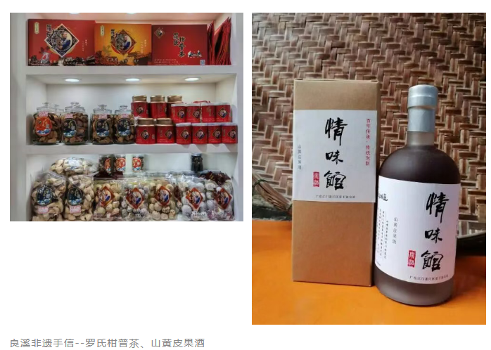 更值得一提的还有良溪的非遗手信罗氏柑普茶和山黄皮果酒。罗氏柑普茶始创于清道光年间,距今已有近两百年历史,茶汤入口甘醇香甜,是果香与茶香碰撞的奇妙化学反应。同样,山黄皮果酒酒味道独特,果香浓郁,有很好的药用价值。良溪非遗手信独具魅力,是良溪人招待贵客、敬送礼品的首要选择。