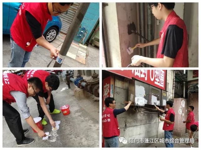 为有效巩固环境卫生整治成果,进一步提升辖区环境卫生面貌,保持干净、整洁的市容市貌,我局一方面继续督促各镇街定期清洗牛皮癣,另一方面也积极参与到挂点社区开展的创文提质专项整治行动中来,协助街道社区做好“牛皮癣”的清洗和卫生保洁。