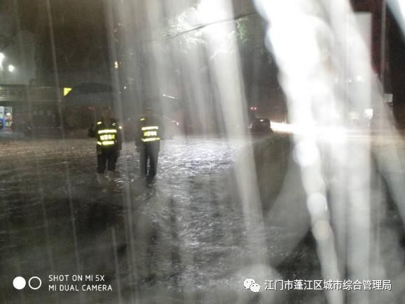 5月8日0点23分,江门市气象台发布暴雨预警中级别最高的红色预警,预警信息并没有阻滞住队员们的脚步,反而激发了抢险队员们的斗志,“狭路相逢勇者胜!”雨下的太大,抢险队员们涉水而过,打开雨水井盖,加快排水速度。