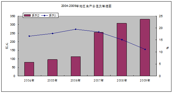 初步核算,2009年全区生产总值331.12亿元,比上年增长11.1%。其中,第一产业增加值7.07亿元;第二产业增加值178.98亿元,增长10.6%;第三产业增加值145.07亿元,增长12.3%。在第三产业中,交通运输、仓储和邮政业增长4.6%,批发和零售业增长18.7%,住宿和餐饮业增长9.2%,金融保险业增长18.9%,房地产业增长30.5%,其他服务业增长7.7%。人均地区生产总值达55848元,同比增长8.78%。GDP综合能耗下降3.92%。