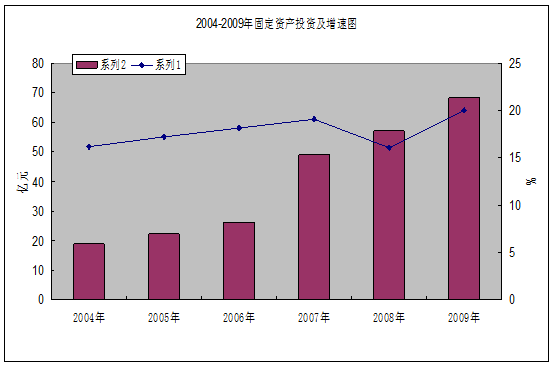 2009年实现全社会固定资产投资68.37亿元,同比增长20.01%。其中基本建设投资16.6亿元,同比增长83.21%;更新改造投资11.33亿元,同比增长34.92%;房地产开发投资40.04亿元,同比增长3.26%。