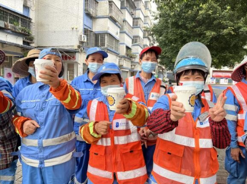 环卫工人黄阿姨开心地说“喝了这杯暖饮身体马上又充满能量,我们一定会做好城市美容师的职责,让我们城市更干净整洁。”