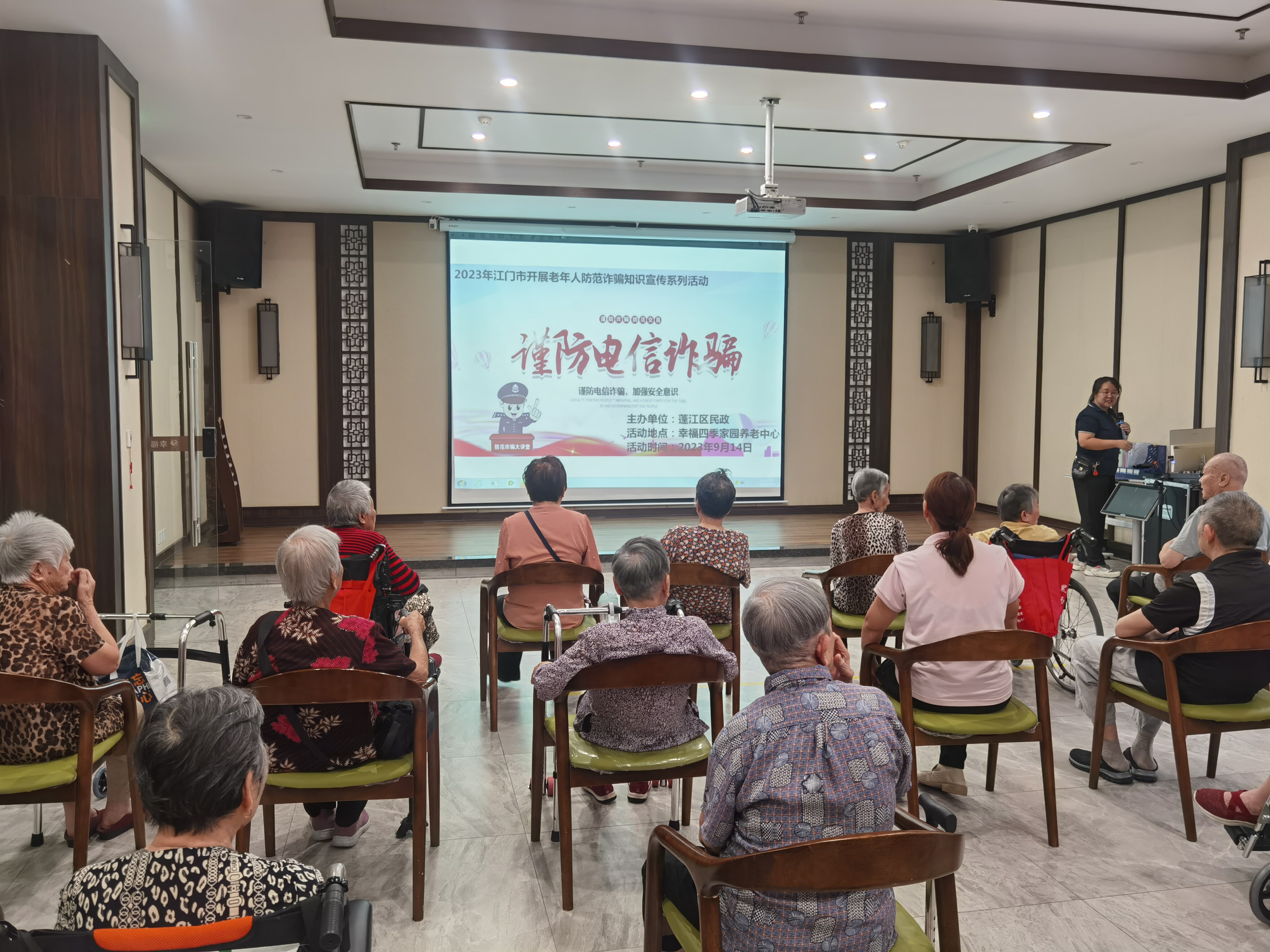 活动中,主讲人以诈骗典型案例作为引入,分析不法分子层出不穷的诈骗手段,提醒老年人时刻注意防范诈骗骗局,并且还向老年人讲解了防范诈骗的知识和技巧,帮助他们从容应对诈骗骗局。同时,主讲人在本次宣传教育中还着重强调了被诈骗后的严重后果,引起老年人们的警惕,强化了本次反诈宣传的效果。