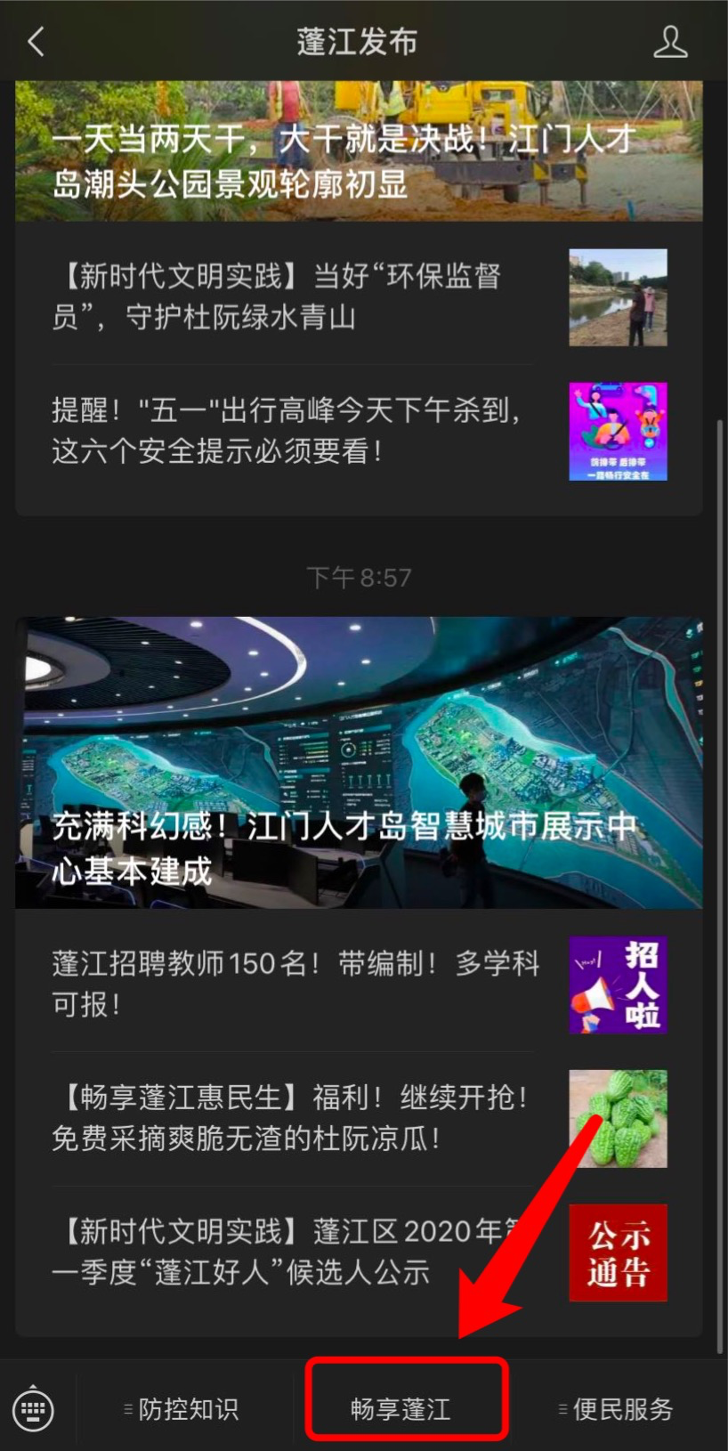 1.扫描下方二维码,或关注微信公众号“蓬江发布”——点击底部菜单栏“畅享蓬江”,进入专题页面。