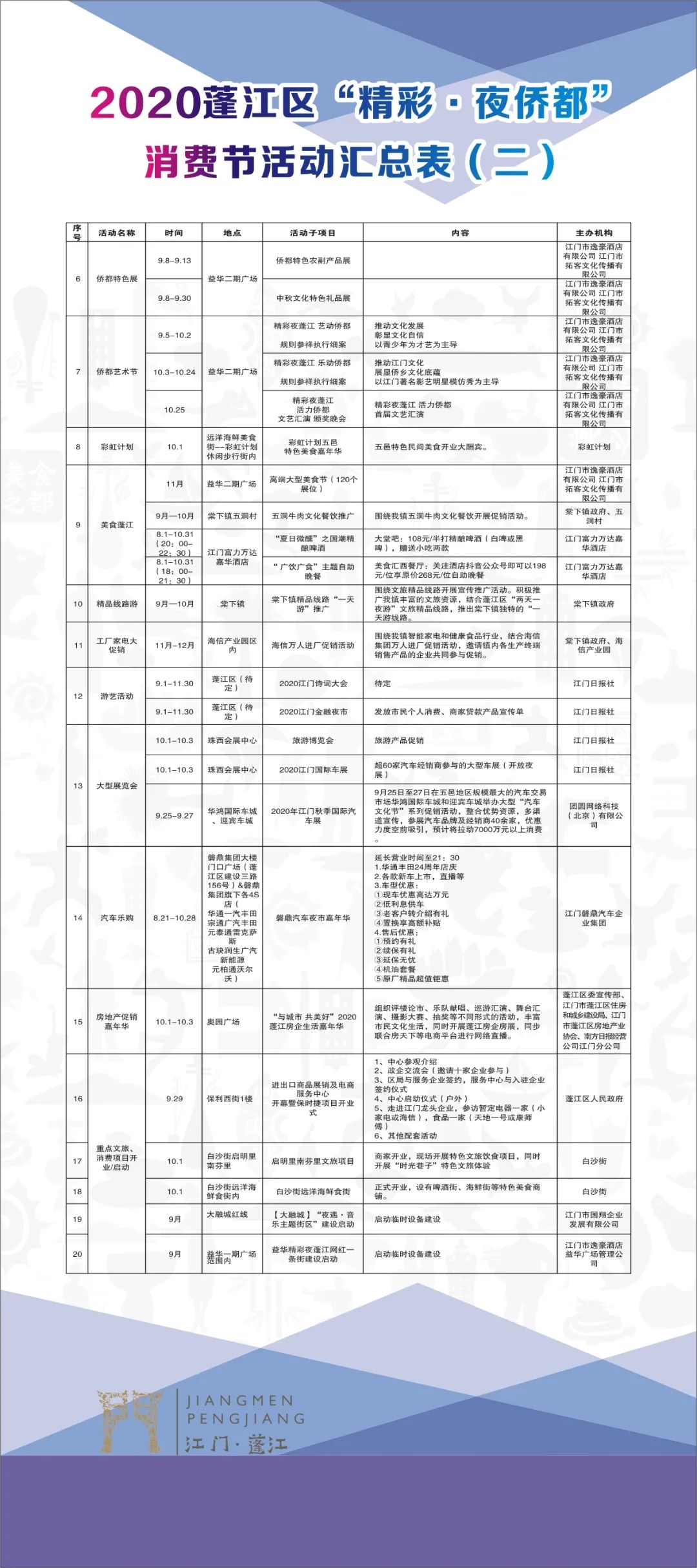 据介绍,这次活动分为文旅嘉年华和“精彩·夜侨都”消费节两大板块,合计19类共70项主题活动,实际开展的活动子项内容超过100个,活动内容涵盖蓬江历史名人、历史文化名村、美食特产等,通过旅游节庆活动与消费活动相结合的方式,丰富春雨直播 旅游产品、丰富群众文体生活、促进夜间经济消费,打响蓬江“世界侨邦”文化名牌。