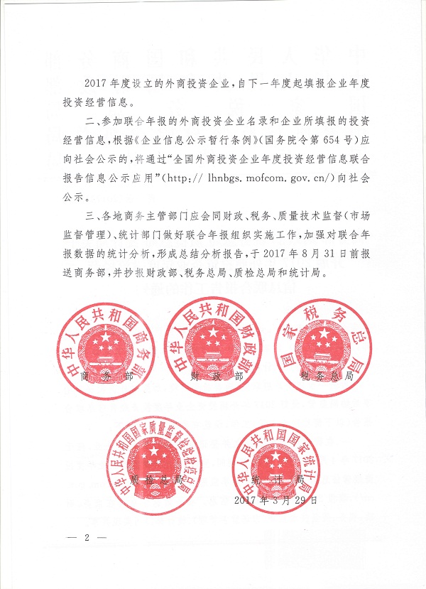 附件:《商务部 财政部 税务总局 质检总局 统计局关于开展2017年外商投资企业年度投资经营信息联合年报工作的通知》(商资函〔2017〕130号)