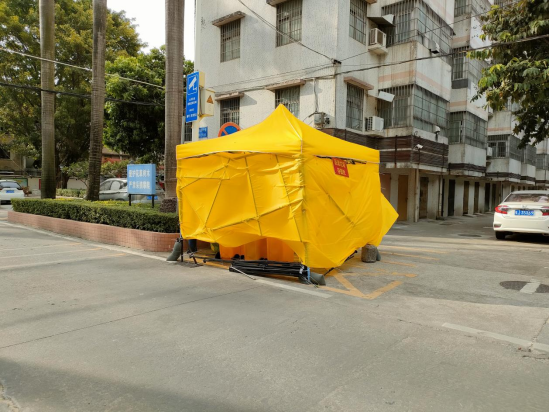 11月1日,台风“尼格”逼近,甘化新村管控区牌坊下立着一个明晃晃的帐篷,抗风能力强的黄色医疗帐篷,“这是一个绝对不能倒下的‘棚坚强’”,现场工作人员笑称。