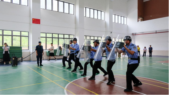 然后,全体参训人员分成两组进行训练,讲练结合。通过训练,学会了防暴器械的使用方法,提高了个人防暴技能和多人配合防暴能力。