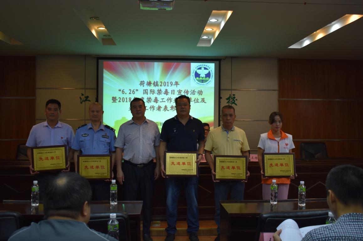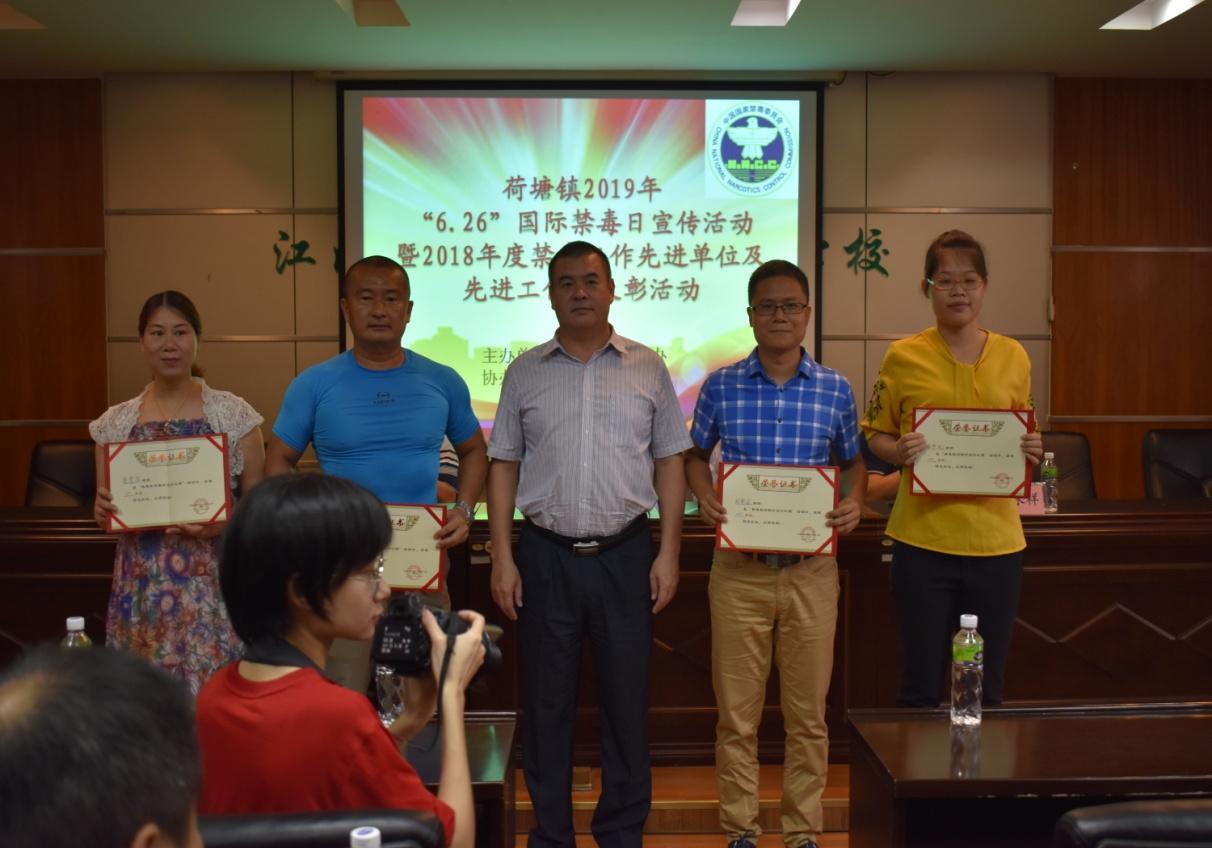 其后,镇党委书记区林杰和镇党委副书记温文辉对荷塘镇2018年度禁毒禁毒工作先进单位及先进禁毒工作者进行表彰,并要求各单位以先进单位及先进工作者为榜样,对标先进,奋发有为,高标准、严要求做好禁毒工作,维护荷塘镇良好治安环境。