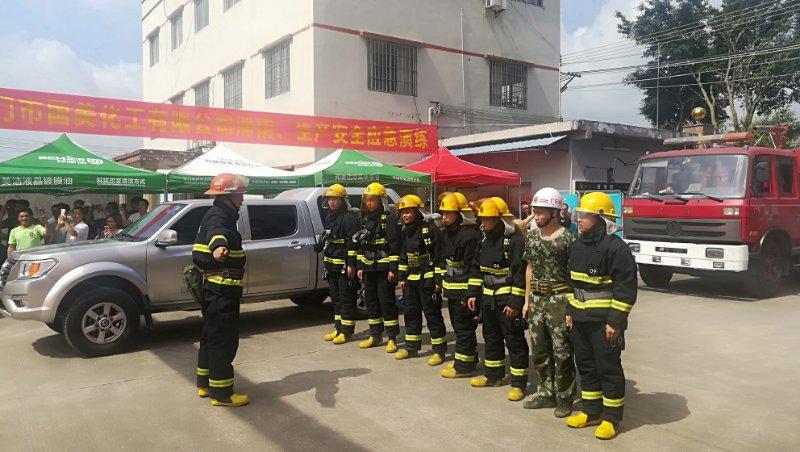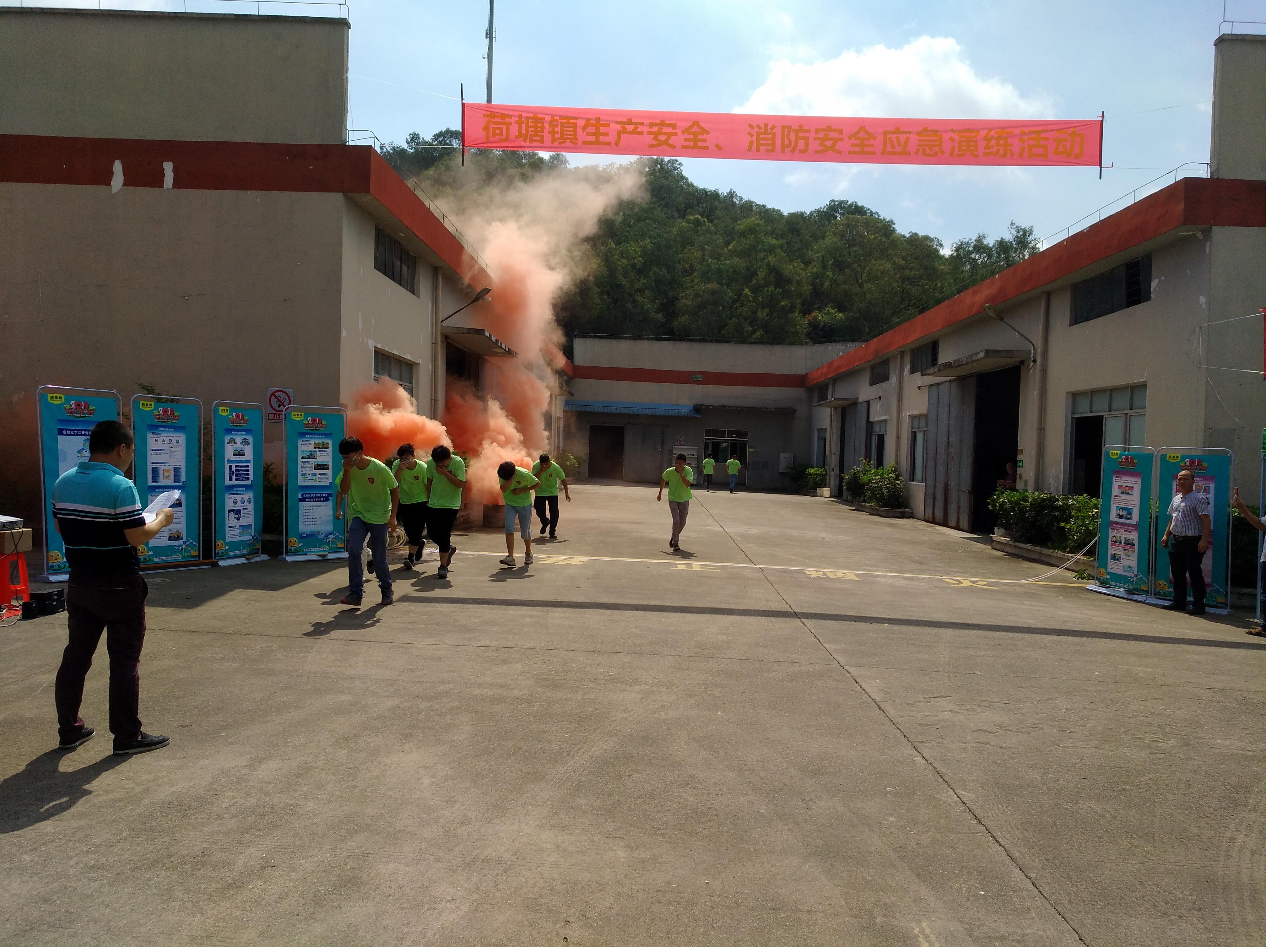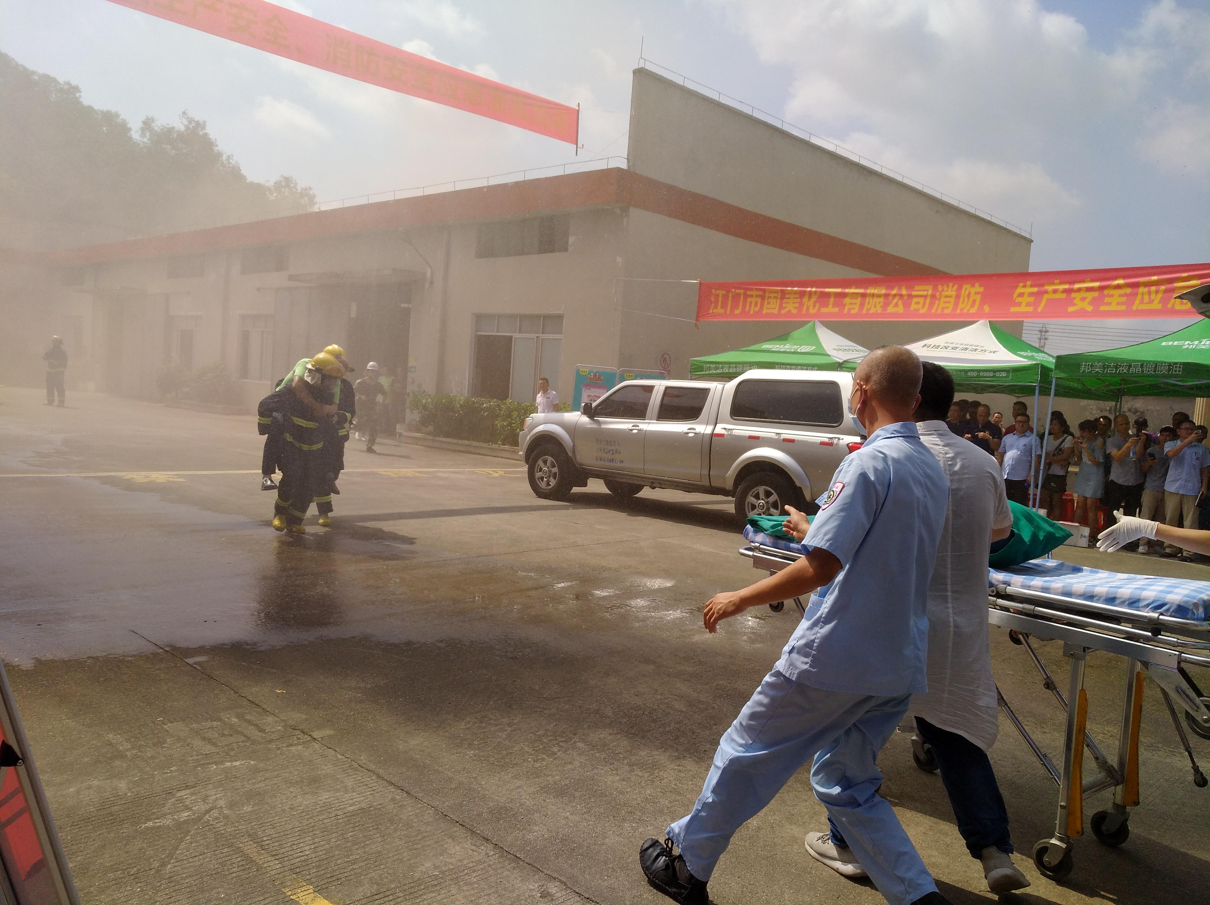 活动现场共有四项流程:一是由荷塘镇安监局负责人王伟国作动员讲话;二是由江门市国美化工有限公司负责人讲述如何配合专家开展日常安全生产管理工作;三是由镇消防专职中队、荷塘卫生院、江门市国美化工有限公司联合开展消防应急演练,并由专家对消防应急演练作点评,现场介绍对企业开展风险管控和隐患排除的相关措施和做法;四是现场进行安全生产咨询并参观车间管理情况。