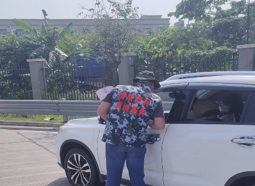 上图为荷塘填退役军人容玉辉在高速口指挥车辆往边停靠