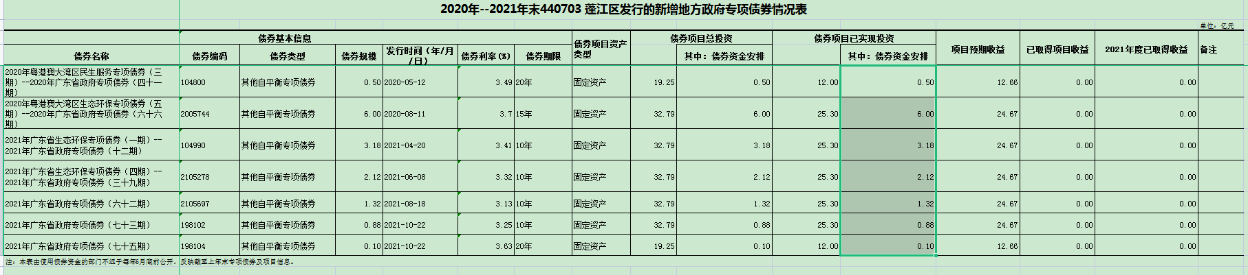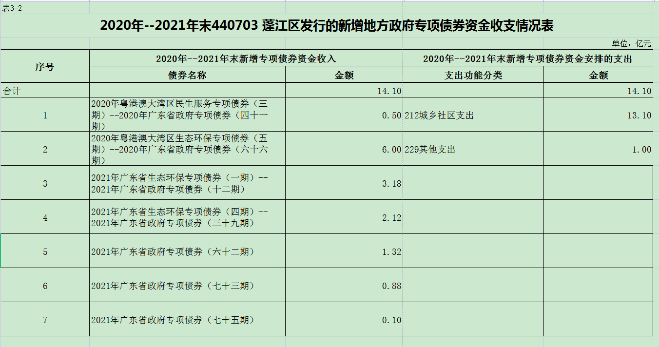 附表:1.2020年--2021年末440703春雨直播 发行的新增地方政府专项债券情况表