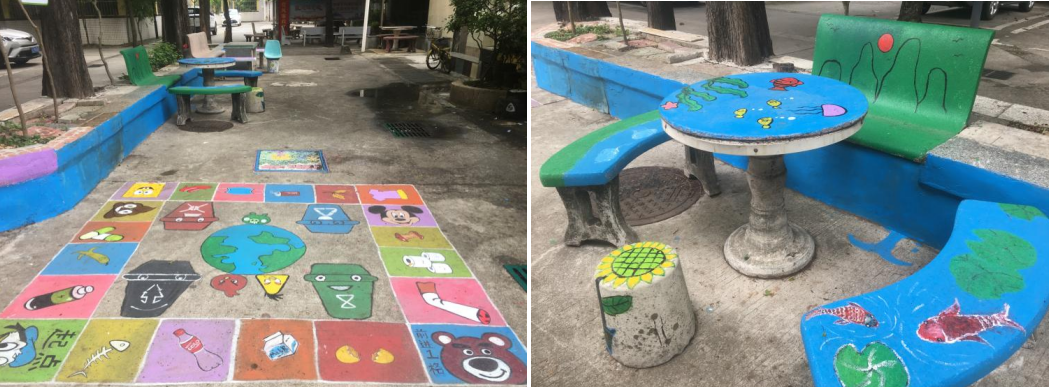 据统计,本次活动共发动15对社区亲子参与,伴随着灵感的激发和居民的努力,“一米画廊”也初见雏形——分类地绘、七彩椅凳、分类游戏等丰富多彩的图案瞬间吸引周边居民纷纷驻足欣赏。在美化社区设施环境的同时,“一米画廊”也充当着无声的“解说员”,将垃圾分类理念传遍社区角落。
