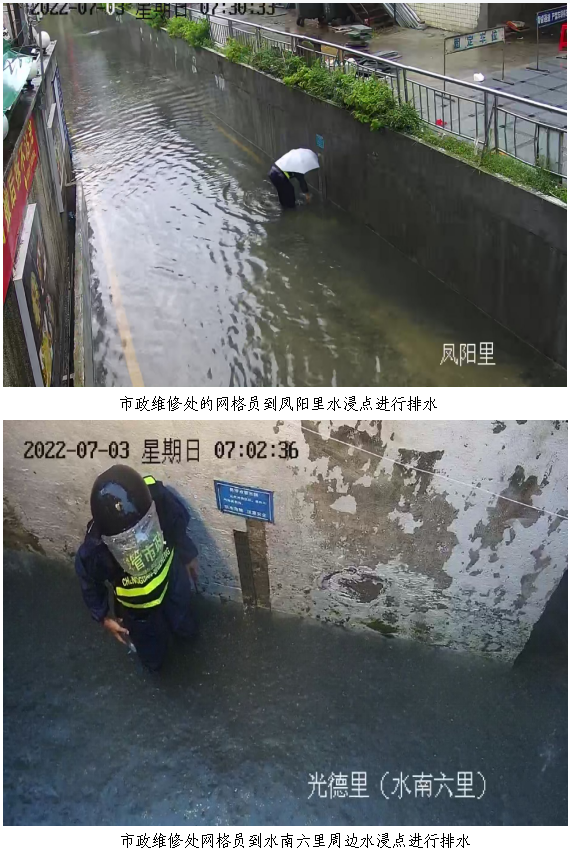 接到汛情后,春雨直播 城市管理和综合执法局立即启动应急抢险响应,迅速出动网格抢险人员赶赴各水浸点进行抢险。