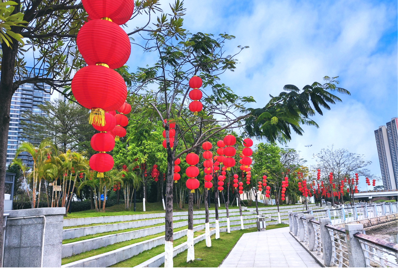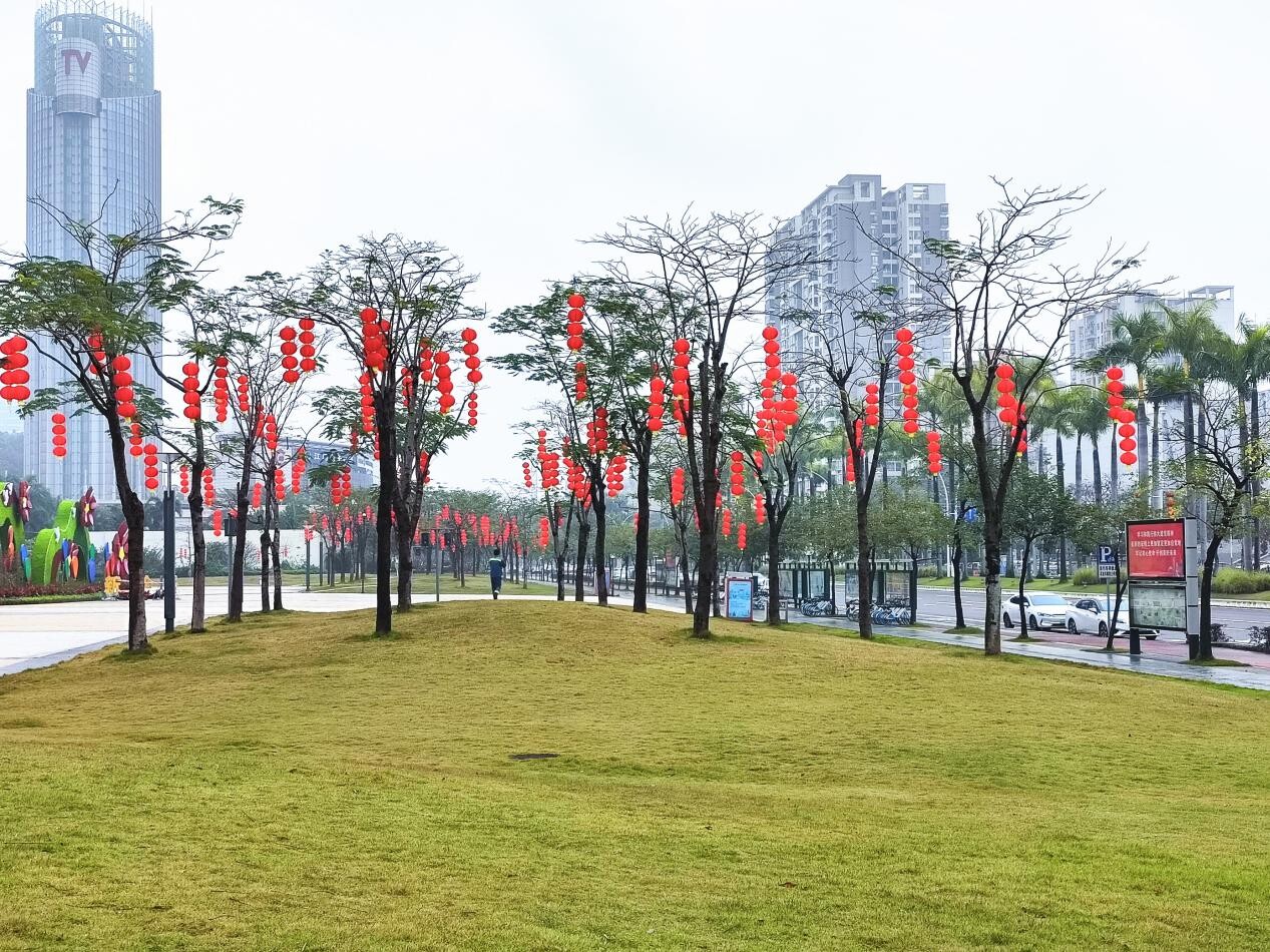 一个个红灯笼悄然地爬上树梢,为蓬江街头增添春节气息