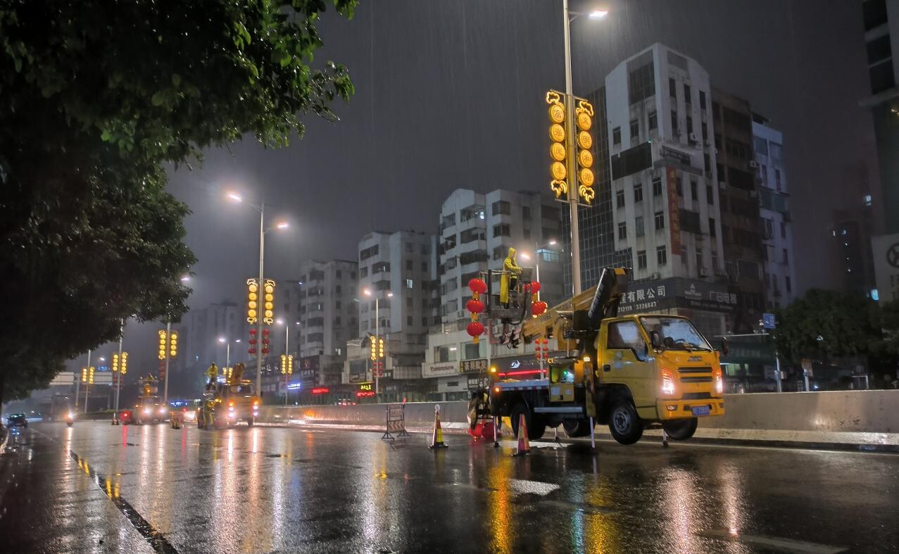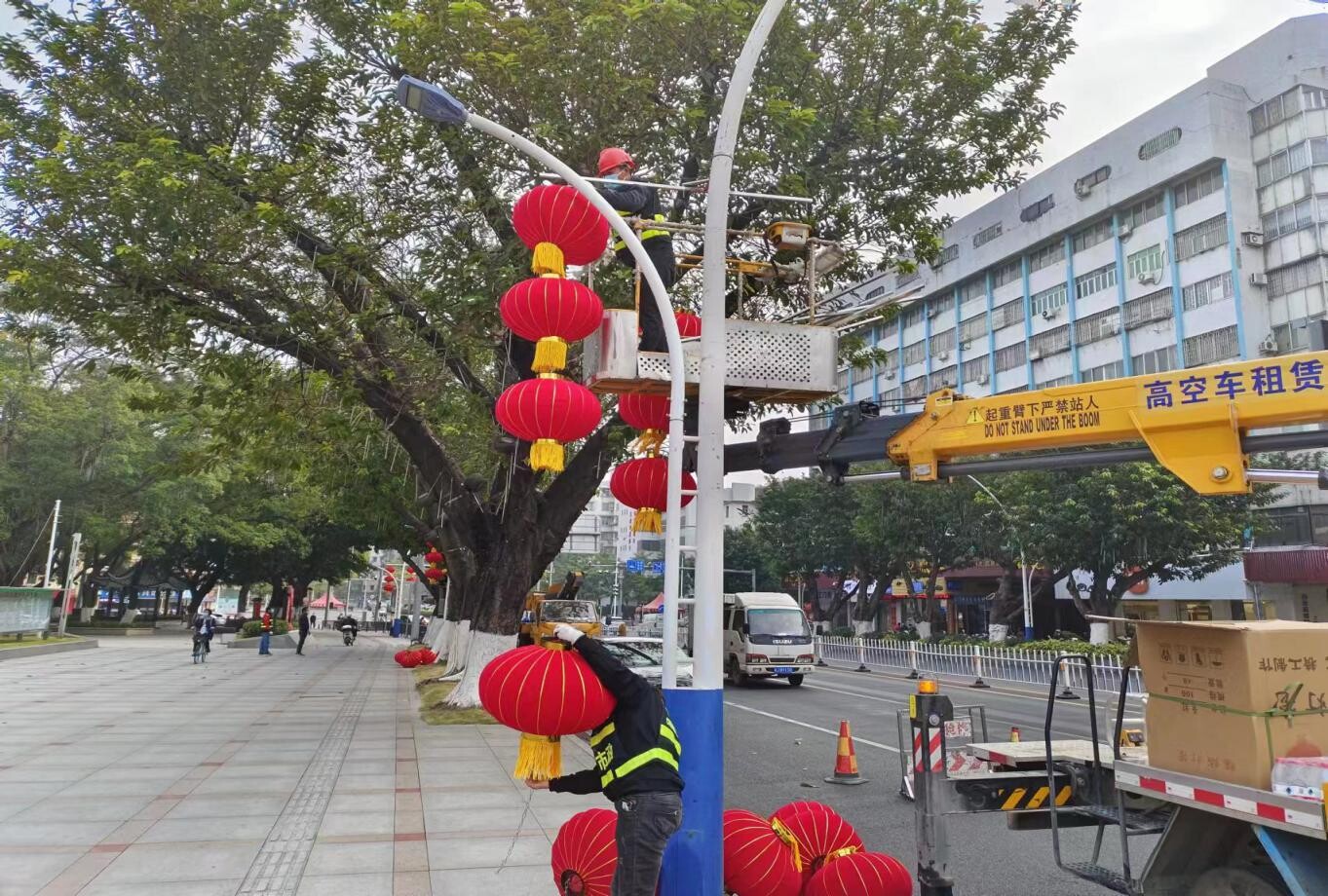 大红灯笼高高挂,市政工人冒雨装扮蓬江大街小巷
