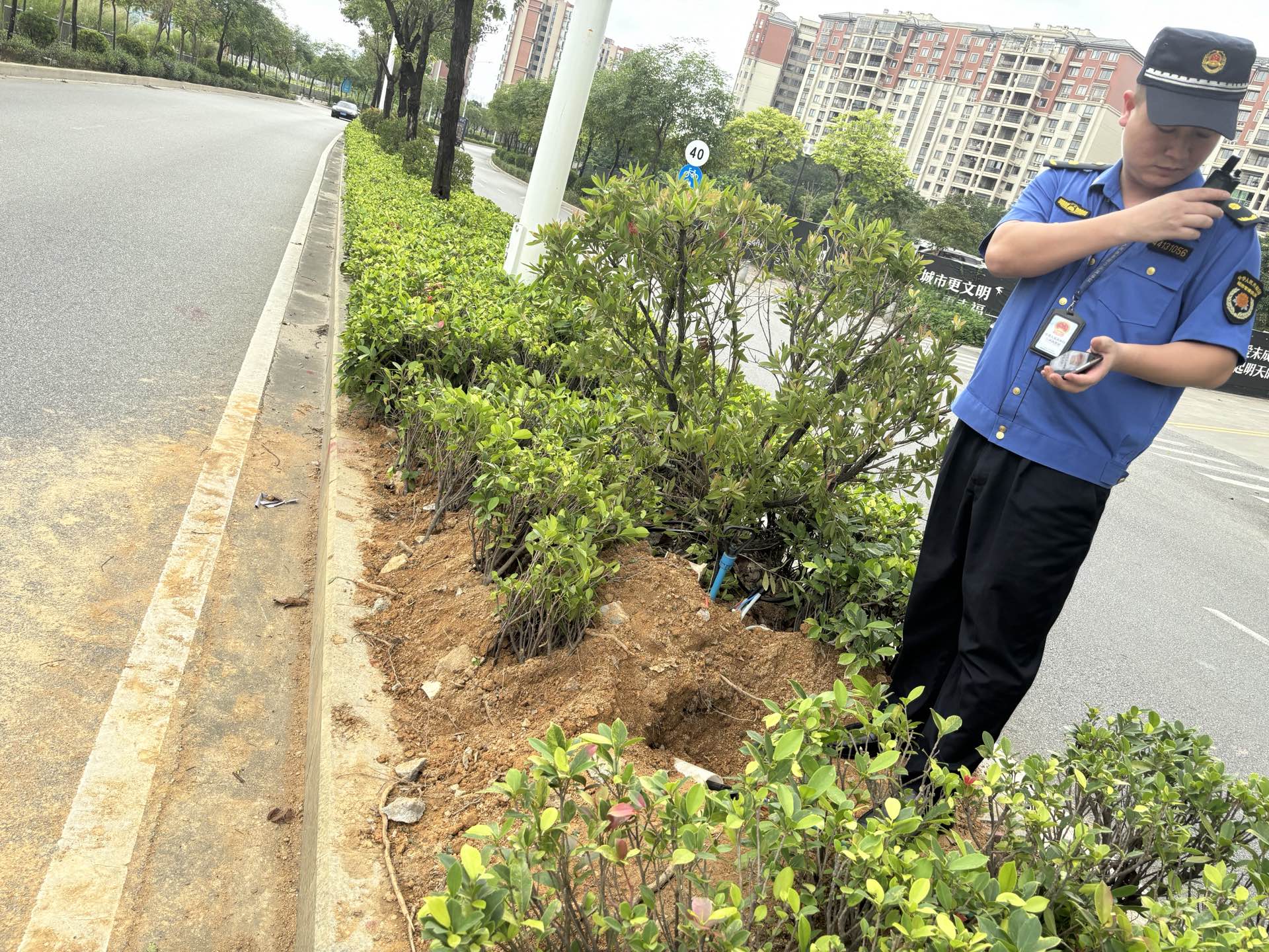 案例二:某个体户在群福路丰叶园路口中间绿化带顶管作业,未经审批擅自占用开挖城市绿地,占用面积约3平方米。执法人员依法对其责令限期退出,恢复原状,作出罚款900元的行政处罚决定。