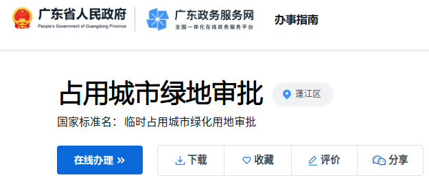 1.线上办理:如需临时占用城市绿地的,可先到广东政务服务官网在线查看办理指南,下载申请表,准备好相关材料,在线办理。