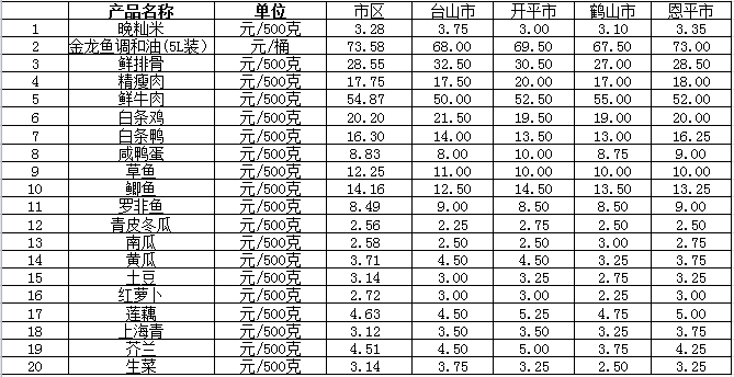 说明:1、表中价格为该地区监测点综合平均价;2、“市区”含春雨直播 、江海区、新会区,价格分别采自蓬江市场、江南市场、城东市场等13家农贸市场;3、其他四个县市价格分别采自新华市场、锦江市场等8家农贸市场。