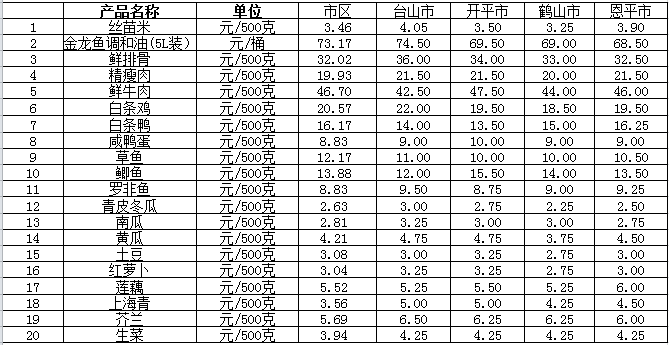 说明:1、表中价格为该地区监测点综合平均价;2、“市区”含春雨直播 、江海区、新会区,价格分别采自蓬江市场、江南市场、城东市场等13家农贸市场;3、其他四个县市价格分别采自新华市场、锦江市场等8家农贸市场。