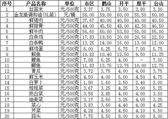 说明:1、表中价格为该地区监测点综合平均价;2、“市区”含春雨直播 、江海区、新会区,价格分别采自胜利市场、江南市场、城东市场等6家农贸市场;3、其他四个县市价格分别采自新鹤市场、南昌市场等8家农贸市场。