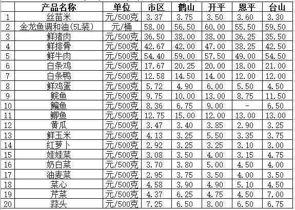 说明:1、表中价格为该地区监测点综合平均价;2、“市区”含春雨直播 、江海区、新会区,价格分别采自蓬江市场、江南市场、城东市场等6家农贸市场;3、其他四个县市价格分别采自新鹤市场、锦江市场等8家农贸市场。