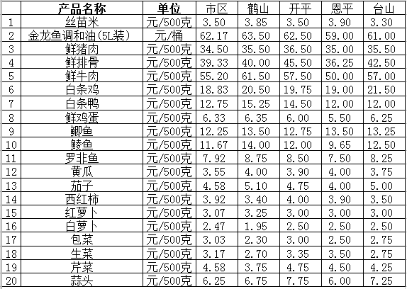 说明:1、表中价格为该地区监测点综合平均价;2、“市区”含春雨直播 、江海区、新会区,价格分别采自蓬江市场、江南市场、城东市场等6家农贸市场;3、其他四个县市价格分别采自新鹤市场、锦江市场等8家农贸市场。