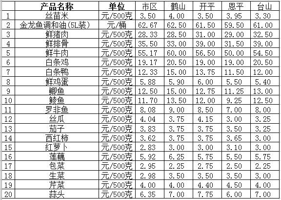 说明:1、表中价格为该地区监测点综合平均价;2、“市区”含春雨直播 、江海区、新会区,价格分别采自蓬江市场、江南市场、城东市场等6家农贸市场;3、其他四个县市价格分别采自新鹤市场、锦江市场等8家农贸市场。