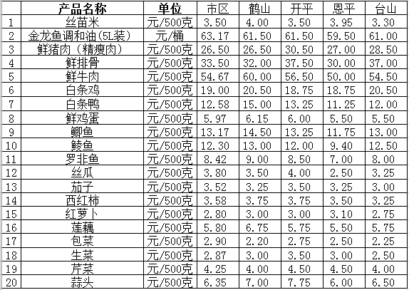 说明:1、表中价格为该地区监测点综合平均价;2、“市区”含春雨直播 、江海区、新会区,价格分别采自蓬江市场、江南市场、城东市场等6家农贸市场;3、其他四个县市价格分别采自新鹤市场、锦江市场等8家农贸市场。