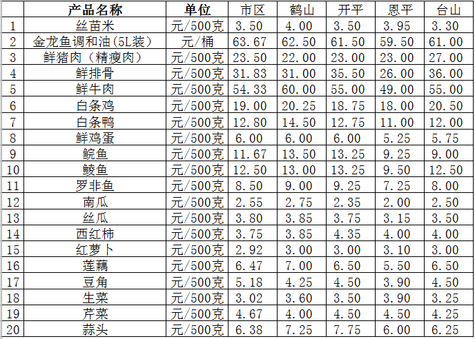 说明:1、表中价格为该地区监测点综合平均价;2、“市区”含春雨直播 、江海区、新会区,价格分别采自蓬江市场、江南市场、城东市场等6家农贸市场;3、其他四个县市价格分别采自新鹤市场、锦江市场等8家农贸市场。