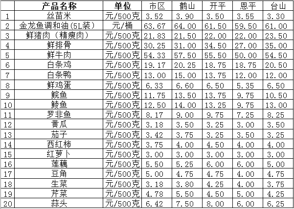 说明:1、表中价格为该地区监测点综合平均价;2、“市区”含春雨直播 、江海区、新会区,价格分别采自蓬江市场、江南市场、城东市场等6家农贸市场;3、其他四个县市价格分别采自新鹤市场、锦江市场等8家农贸市场。