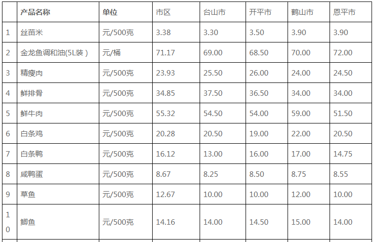 说明:1、表中价格为该地区监测点综合平均价;2、“市区”含春雨直播 、江海区、新会区,价格分别采自蓬江市场、江南市场、城东市场等13家农贸市场;3、其他四个县市价格分别采自新华市场、锦江市场等8家农贸市场。