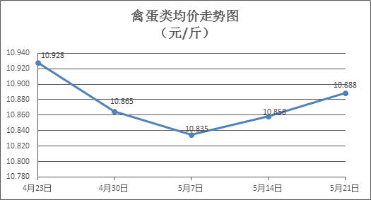 家禽类商品价格小幅上涨。上周所监测的6种禽蛋类商品价格波动情况为4涨2跌,综合零售均价为10.888元/斤,环比上涨0.28%。其中:白条鸡、白条鸭零售均价分别为每斤19.77元、15.52元,环比分别上涨0.30%、上涨1.84%;白壳鸡蛋、鸭蛋零售均价分别为每斤6.71元、7.90元,环比分别下降1.47%、上涨0.89%。