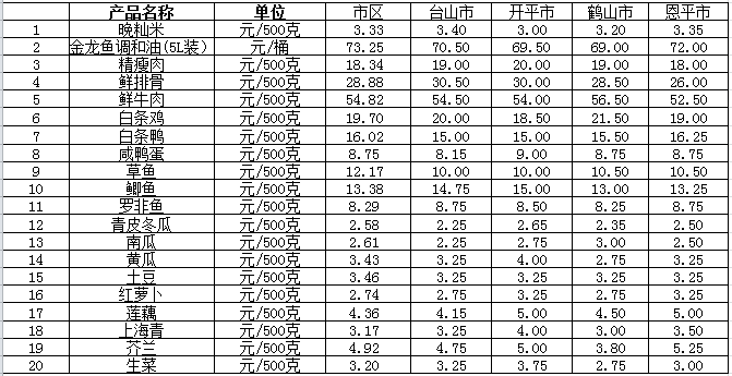 说明:1、表中价格为该地区监测点综合平均价;2、“市区”含春雨直播 、江海区、新会区,价格分别采自蓬江市场、江南市场、城东市场等13家农贸市场;3、其他四个县市价格分别采自新华市场、锦江市场等8家农贸市场。