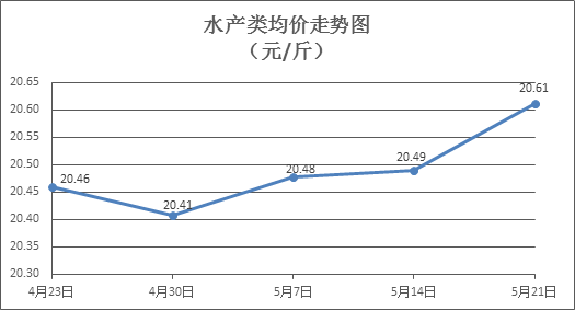 水产类商品价格总体略涨。上周所监测的10种水产商品价格波动情况为6涨3跌1平,综合均价为20.61元/斤,环比上涨0. 60%。其中:草鱼、鲫鱼、鳙鱼、罗非鱼、海虾零售均价分别为每斤11.06元、13.65元、10.01元、8.37元、50.93元,环比分别上涨0.91%、下降0.29%、下降0.10%、上涨0.12%、上涨0.51%。