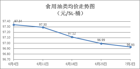 食用油类商品价格微幅下降。上周所监测的9种食用油(5L装)商品价格波动情况为2涨6跌1平,综合零售均价为96.93元/桶,环比下降0.07%。其中:鲁花花生油、金龙鱼调和油零售均价分别为每桶157.20元、71.43元,环比分别下降0.06%、下降0.04%。