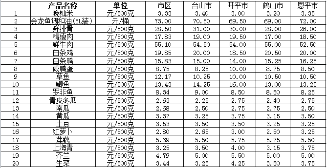 说明:1、表中价格为该地区监测点综合平均价;2、“市区”含春雨直播 、江海区、新会区,价格分别采自蓬江市场、江南市场、城东市场等13家农贸市场;3、其他四个县市价格分别采自新华市场、锦江市场等8家农贸市场。