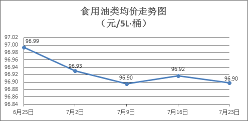 食用油类商品价格总体微跌。上周所监测的9种食用油(5L装)商品价格波动情况为1涨6跌2平,综合零售均价为96.90元/桶,环比下降0.02%。其中:金龙鱼花生油、金龙鱼调和油零售均价分别为每桶105.70元、71.07元,环比分别下降0.04%、下降0.06%。