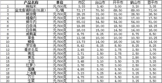 说明:1、表中价格为该地区监测点综合平均价;2、“市区”含春雨直播 、江海区、新会区,价格分别采自蓬江市场、江南市场、城东市场等13家农贸市场;3、其他四个县市价格分别采自新华市场、锦江市场等8家农贸市场。