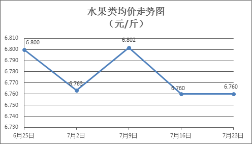 水果类商品价格基本平稳。上周所监测的6种水果商品价格均持平,综合零售均价为6.760元/斤。其中苹果、葡萄、梨零售均价分别为每斤7.39元、14.26元、6.64元,环比均持平。