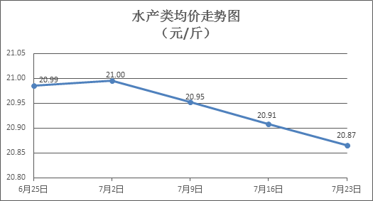 水产类商品价格稳中略降。上周所监测的10种水产商品价格波动情况为3涨3跌4平,综合均价为20.87元/斤,环比下降0. 21%。其中:草鱼、鲢鱼、鳙鱼、罗非鱼、基围虾零售均价分别为每斤11.06元、9.92元、10.24元、8.42元、37.61元,环比分别持平、持平、持平、上涨0.48%、下降1.80%。