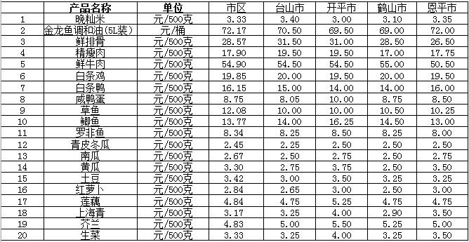 说明:1、表中价格为该地区监测点综合平均价;2、“市区”含春雨直播 、江海区、新会区,价格分别采自蓬江市场、江南市场、城东市场等13家农贸市场;3、其他四个县市价格分别采自新华市场、锦江市场等8家农贸市场。
