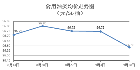 食用油类商品价格稳中微降。上周所监测的9种食用油(5L装)商品价格波动情况为1涨6跌2平,综合零售均价为96.59元/桶,环比下降0.17%。其中:鲁花花生油、金龙鱼调和油零售均价分别为每桶157.26元、70.79元,环比分别下降0.01%、下降0.24%。