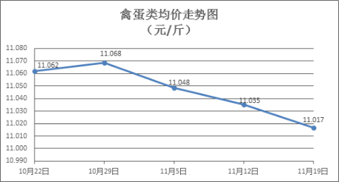 禽蛋类商品价格小幅下降。上周所监测的6种禽蛋类商品价格波动情况为1涨5跌,综合零售均价为11.017元/斤,环比下降0.17%。其中:白条鸡、白条鸭零售均价分别为每斤19.64元、15.36元,环比分别下降0.10%、上涨0.39%;白壳鸡蛋、鸭蛋零售均价分别为每斤6.95元、8.13元,环比分别下降1.00%、下降0.25%。