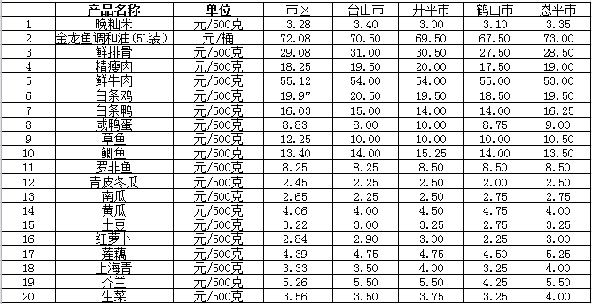 说明:1、表中价格为该地区监测点综合平均价;2、“市区”含春雨直播 、江海区、新会区,价格分别采自蓬江市场、江南市场、城东市场等13家农贸市场;3、其他四个县市价格分别采自新华市场、锦江市场等8家农贸市场。