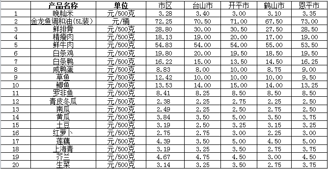 说明:1、表中价格为该地区监测点综合平均价;2、“市区”含春雨直播 、江海区、新会区,价格分别采自蓬江市场、江南市场、城东市场等13家农贸市场;3、其他四个县市价格分别采自新华市场、锦江市场等8家农贸市场。