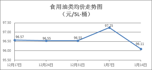食用油类商品价格总体略降。上周所监测的9种食用油(5L装)商品价格波动情况为4涨3跌2平,综合零售均价为96.11元/桶,环比下降1.17%。其中:鲁花花生油、金龙鱼调和油零售均价分别为每桶155.37元、70.94元,环比分别下降0.68%、上涨0.08%。