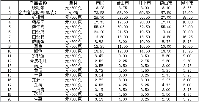说明:1、表中价格为该地区监测点综合平均价;2、“市区”含春雨直播 、江海区、新会区,价格分别采自蓬江市场、江南市场、城东市场等13家农贸市场;3、其他四个县市价格分别采自新华市场、锦江市场等8家农贸市场。